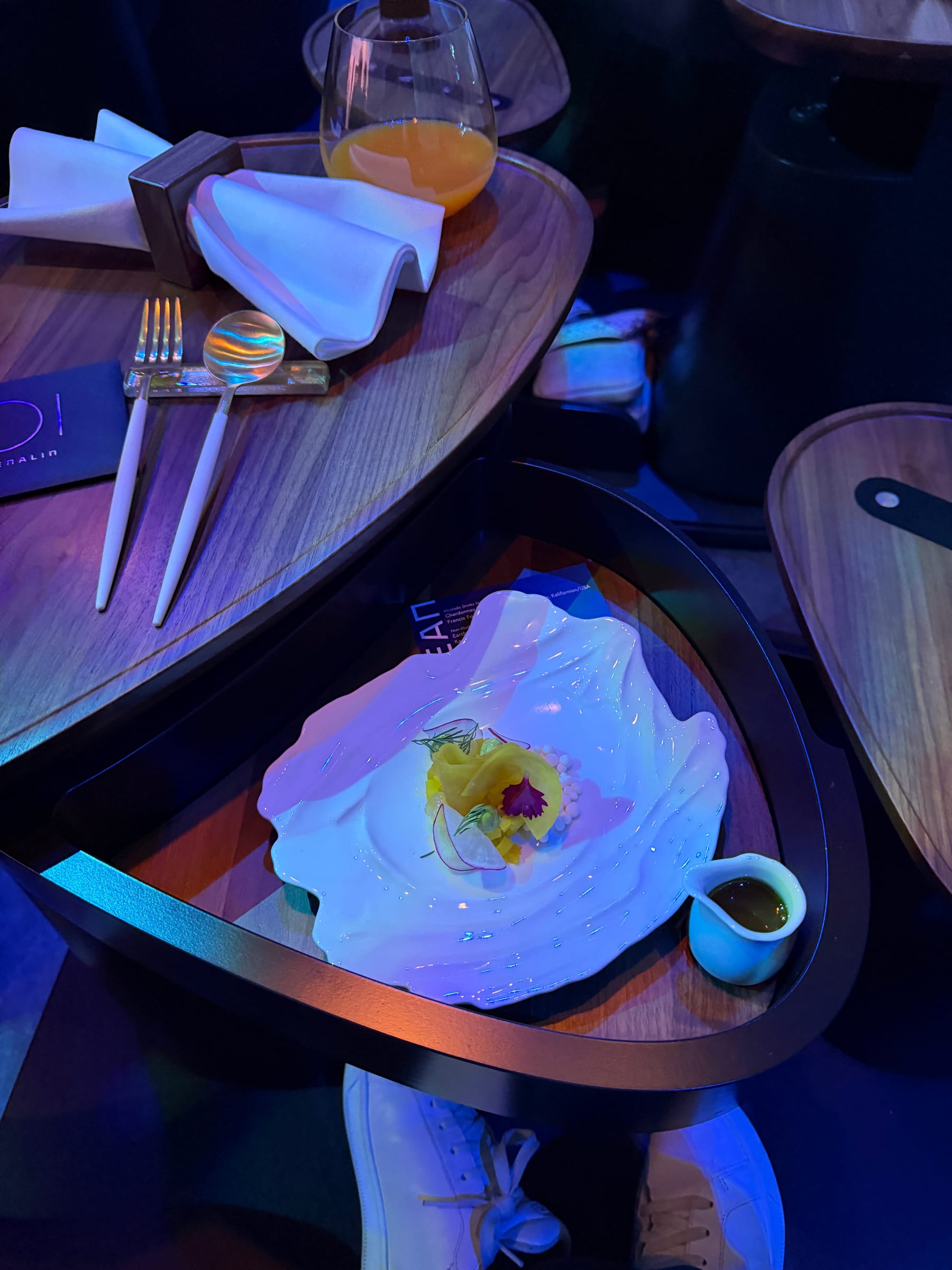 Die Experience ist multisensorisch angelegt. Man sitzt nicht einfach an einem festen Tisch und bekommt Gang für Gang gebracht. Man bewegt sich durch verschiedene Räume und Stimmungen. Der sogenannte Floating Chair ist dabei kein Gimmick, sondern Teil der Dramaturgie. Er sorgt dafür, dass die Gäste nicht nur schauen, sondern körperlich in die Inszenierung hineingenommen werden.