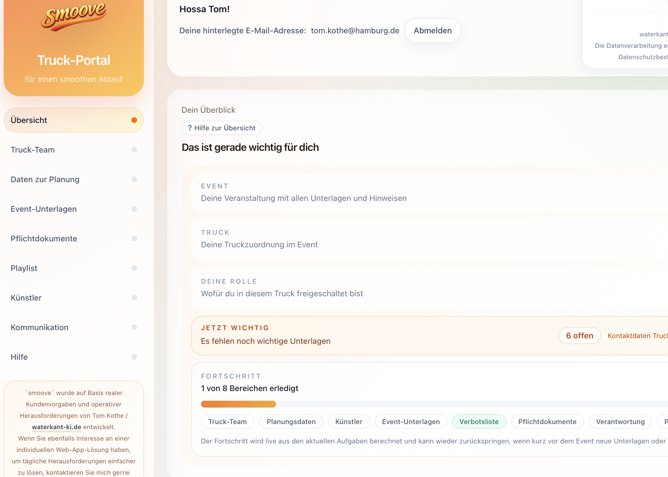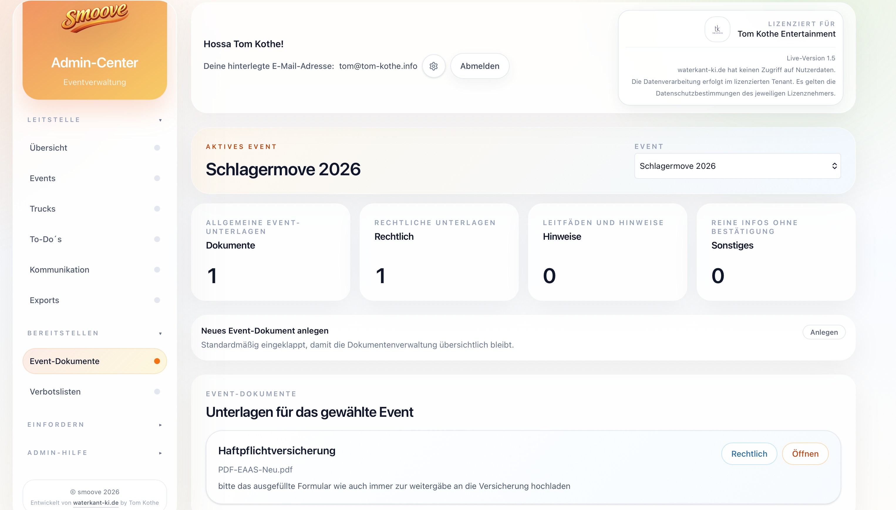 Für die Hossa Hossa Veranstaltungs GmbH hinter schlagermove.de durfte ich mit SMOOVE genau an so einem Punkt ansetzen: nicht als generisches Standardtool, sondern als Eigenentwicklung entlang einer sehr konkreten operativen Realität.